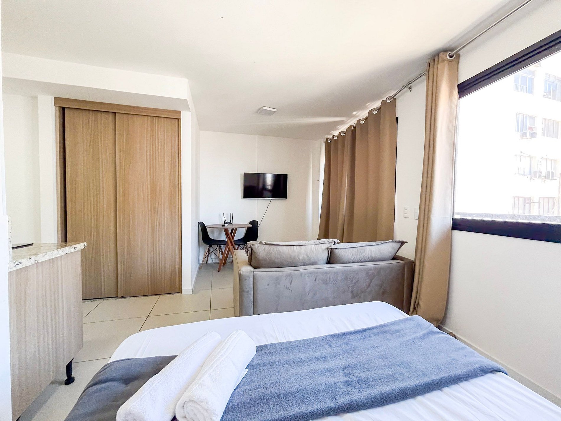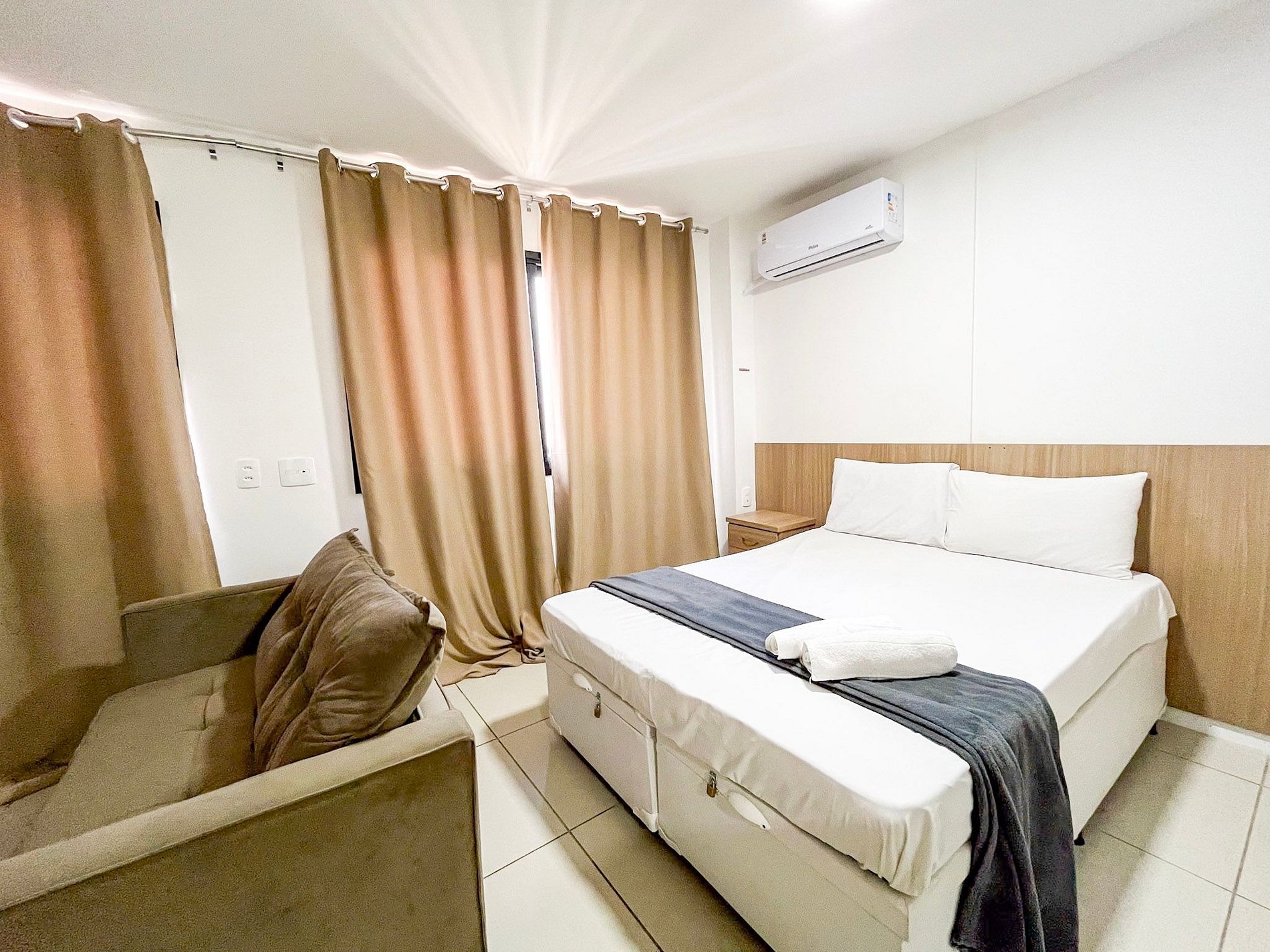 Todos os hóspedes da reserva terão à disposição roupas de cama, toalhas de banho e travesseiros em quantidade suficiente. Parte estará posicionada na cama de casal e o restante ficará organizado no armário, de fácil acesso aos hóspedes.